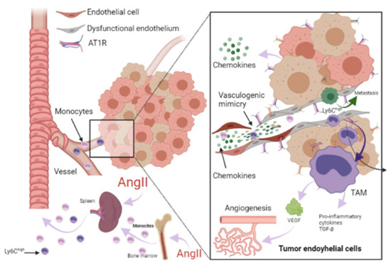 Role of RAAS in the tumor microenvironment. Immune cells can infiltrate tumors and differentiate into tumor-associated macrophages (TAM) derived mainly from circulating monocytes and are attracted to the tumor by chemokines. TAMs can stimulate tumor cell proliferation, angiogenesis, invasion and metastasis. Additionally, tumor microenvironment (TME) can influence the phenotype of circulating monocytes such as the Ly6Chigh monocyte subset, giving them an immunosuppressive activity and a decreased responsiveness to inflammatory stimuli before their infiltration intoTME. Angiotensin-II (AngII) plays a relevant role in macrophage-mediated chronic inflammation, increasing macrophage progenitors and supplying of TAMs. Additionally, endothelial cells (EC) can promote pro-inflammatory signaling, favoring spontaneous metastasis in adjacent tumors through an aberrant expression of pro-inflammatory cytokines, extracellular matrix, alterations in the leukocyte adhesion process, increasing vascular cell adhesion molecule-1 (VCAM-1) and abnormal responses to oxidative stress. In ECs, AngII/AT1R signaling generates a pro-angiogenic response mediated by vascular endothelial growth factor (VEGF). AngII signaling activates TNF-α and NF-κB and upregulates pro-inflammatory endothelial chemokines. AngII has been reported to be able to promote VCAM-1 expression and enhance adhesion, growth, angiogenesis, and the inflammatory microenvironment through AT1R in hepatocellular carcinoma. It has been reported that angiogenesis promotes tumor cell metastasis. Image created with BioRender.com, Toronto, ON, Canada.