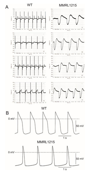 (A): Extracellular field potential (EFP) signals recorded in WT (left side) and MMRL1215 hiPSC-CMs (right side). Compared to WT hiPSC, myocytes derived from MMRL1215 showed a complete lack of a pseudo QRS complex, suggesting a major reduction in inward current(s). Panel (B): Action potential (AP) recordings obtained from WT and MMRL1215 monolayers. MMRL1215 hiPSC-CMs had a shorter action potential duration compared to WT.