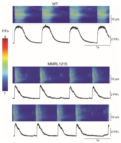 Line scans recorded from WT and MMRL1215 hiPSC-CMs showing spontaneous Ca2+ transients. Fluorescence intensity was much lower in MMRL 1215, and in some myocytes the spontaneous activity was episodic in nature.