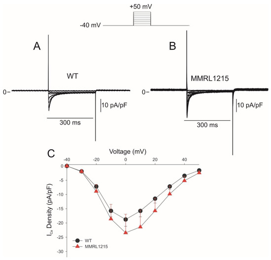 The lower fluorescence intensity in 1215 hiPSC-CMs may indicate that there is less intracellular Ca2+ during an action potential secondary to a shorter AP duration [24]. Alternatively, the EFP recordings suggested that inward current(s) were altered and, therefore, the density of ICa may be lower. We next performed patch clamp experiments to measure inward ICa from WT and MMRL1215 hiPSC myocytes (Figure 4). ICa was elicited by application of 300 ms step depolarizations from −40 to +50 mV and extended protocols were avoided to prevent current rundown. Peak ICa density was −18.8 ± 2.5 pA/pF for WT and −23.4 ± 6.5 pA/pF for MMRL1215. The summarized data on ICa current density in WT and MMRL1215 is shown in Figure 4C and no difference in current density was observed.