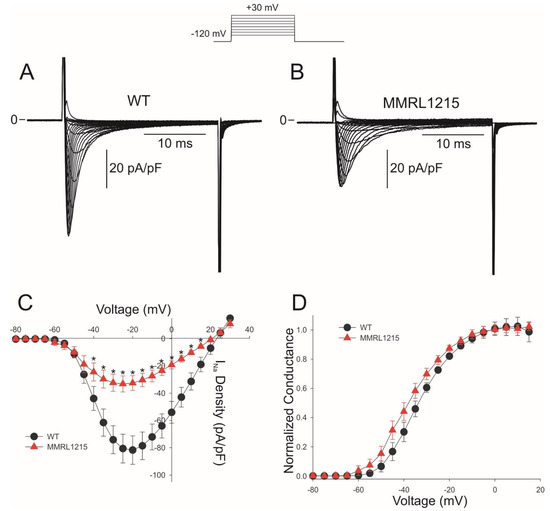 Representative whole cell INa recordings from WT and MMRL1215 hiPSC-CMs (A,B). Current recordings were obtained at test potentials between −80 and 30 mV (protocol at top of figure). (C): I–V relation for WT (n = 18) and MMRL1215 (n = 25) myocytes. (D): Steady-state activation curves for WT and MMRL1215 myocytes. Data were normalized and plotted against their test potential. * Statistically significant from WT, p < 0.05.