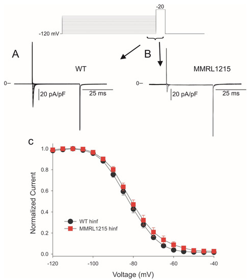 Representative steady-state inactivation recordings from WT and MMRL1215 myocytes (A,B) in response to the voltage clamp protocol (top of the figure). The steady state-inactivation relation for hiPSC-CMs (C) yielded similar mid-inactivation potential for WT (n = 25) and MMRL1215 (n = 29) cells.