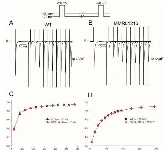 In the next series of experiments, we determined if INa recovery from inactivation was altered in WT and MMRL1215 myocytes. Recovery was determined using a double pulse protocol and was evaluated at holding potentials of −120 mV and −100 mV for both cell types. Figure 7 shows representative traces recorded from a WT (Panel A) and MMRL1215 myocyte (Panel B) at a holding potential of −100 mV (protocol shown at the top of the figure). Reactivation was much faster when hp = −120 mV but was not significantly different between WT and MMRL1215. At hp = −120 mV, both cell types exhibited a fast and slow phase of recovery with time constants as follows: 6.7 ± 0.33 ms and 46.67 ± 6.69 ms for WT myocytes and 4.97 ± 1.10 ms and 35.18 ± 7.49 ms for MMRL 1215 myocytes (Figure 7C). Similarly, at hp = −100 mV the time constants for recovery were 18.5 ± 2.0 ms and 64.78 ± 10.78 ms for WT myocytes and 15.6 ± 2.70 ms and 69.77 ± 14.78 ms for MMRL 1215 myocytes (Figure 7D).