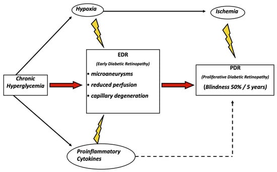Diabetic retinopathy (DR) is one of the most common and serious chronic complications of diabetes, affecting around 47–70% of patients with a diagnosis of T1D, which counts for 10-20% of all diabetes cases, and 26–40% of patients with T2D [,]. Almost the totality of type 1 diabetes patients will develop some degree of retinal damage, which will also affect in the same timeframe more than 60% of patients with type 2 diabetes []. A 2013 report from the American Academy of Ophthalmology estimated a global prevalence of diabetic retinopathy at around 93 million people []. Patients with early diabetic retinopathy commonly have retinal asymptomatic microaneurysms, reduced perfusion, and capillary degeneration, later followed by ischemic hypoxia that in turn stimulates vasoproliferative factors such as VEGF. This slow degenerative process favors the progression towards the most severe and late forms of proliferative diabetic retinopathy (PDR) that, if left untreated, can progress to diabetic macular edema (DME), occurring in up to 12% of patients with T2D, and blindness, occurring in about 50% of untreated patients within 5 years of the diagnosis [,]. Chronic hyperglycemia, hypoxia, and release of inflammatory molecules (e.g., tumor necrosis factor, TNF-α, or Interleukin-1β, IL-1β) have a strong impact on retinal homeostasis by promoting on the one hand vascular dysfunction and pathological angiogenesis, both a cause of proliferative diabetic retinopathy, and on the other increased capillary permeability, with the associated production of hemorrhages and inflammatory exudate []. These processes in the final stage of the disease lead to legal blindness, with a 2.4-fold increased risk in patients with diabetes compared to an individual without diabetes []. The World Health Organization estimates that 2.6% of vision impairment and blindness can be assigned to diabetic retinopathy []. Blindness is of course a cause of substantial individual discomfort and a heavy burden for families and society, making diabetes the main risk factor for preventable blindness in the working-age population between 20 and 74 years in developed countries []. Treatment of diabetic retinopathy includes a strict metabolic control combined with anti-angiogenetic drugs and corticosteroids, but it is not very effective, as it is estimated that the proliferative forms of the disease still appear after 30 years of disease in about 20% of patients with T2D treated with intensive metabolic control []. Therefore, an in-depth investigation of the cellular and molecular mechanisms underlying diabetic retinopathy is of vital importance for the development of new and more efficient treatment options.