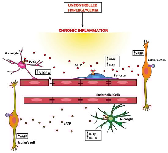 A dysregulation of the ATP-P2X7R axis is a main factor in the pathogenesis of diabetic retinopathy. Hyperglycemia is a cause of chronic inflammation, tissue damage, and cytokine (e.g., IL-1β or TNF-α) release. These events promote ATP release. For example, ATP release can be promoted by ligation of CD40 by CD40L on the plasma membrane of Müller cells or by the activation of the P2X7R itself. The increase in the extracellular ATP (eATP) concentration amplifies inflammation by activating the P2X7R expressed in the retina by several cell types (e.g., Müller cells, astrocytes, microglia, and pericytes), thus causing further release of cytokines and vascular endothelial growth factor (VEGF). VEGF in turn causes a breakdown of the blood–retinal barrier (BRB) promoting the formation of inflammatory exudate and inflammatory cell migration form circulation.