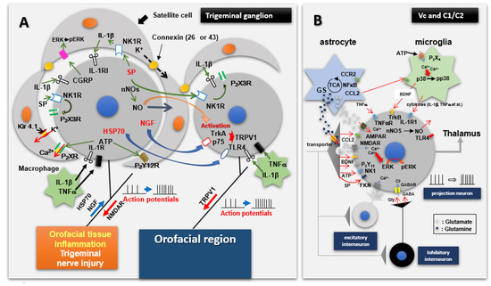 Mechanisms involved in initiation and transmission of nociceptive afferent information from orofacial tissues. (A) shows that trigeminal nerve injury or orofacial inflammation can induce hyperexcitability of trigeminal primary afferent neurons, satellite glial cell activation and macrophage accumulation. The hyperactivated trigeminal ganglion (TG) neurons as well as the satellite glial cells and macrophages communicate with each other through a variety of mediators, receptor mechanisms and signalling processes, many of which are shown here. Through this communication, further enhancement of the excitability of TG afferent neurons may occur, as manifested in their hyperexcitable input into components of the trigeminal brainstem sensory nuclear complex, in particular the medullary dorsal horn (also known as trigeminal subnucleus caudalis [Vc]), as well as the upper cervical spinal cord (C1/C2). (B) shows input and output features of nociceptive neurons in the medullary dorsal horn and C1/C2 under normal conditions as well as pathological conditions such as trigeminal nerve injury or orofacial inflammation which produces the hyperexcitable nociceptive afferent input shown in A. This input releases mediators which cause the neurons to become hyperactive, resulting in activation of microglia and astrocytes. Neuron–glial cell communication via various molecules, several of which are shown here, is important in fostering the hyperexcitable state of the neurons, i.e., central sensitization. From Iwata and Sessle [25].