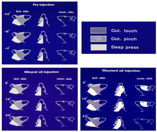 The neuronal parameters of central sensitization, along with some features of peripheral sensitization reflecting hyperexcitability of afferent inputs, are consistent with the sensory experiences of human subjects under acute or chronic experimental orofacial pain conditions [2,4,10,54]. They contribute to the allodynia, hyperalgesia, pain spread and spontaneous pain that are typical clinical features of many types of chronic pain, neuropathic or otherwise. Indeed, trigeminal central sensitization is also apparent in animal models of orofacial inflammatory or surgically induced pain, as exemplified by the expanded receptive fields of MDH nociceptive neurons that may include contralateral or cervical areas. An example is shown in Figure 3 where compared with control values, mechanoreceptive fields expanded 143%, 187% and 140%, respectively, for the pinch, tactile and deep pressure components of the receptive fields that encompassed contralateral facial and cervical areas at 5 min after the intramuscular injection of the inflammatory irritant mustard oil [89]. Findings such as these in a variety of pain models have resulted in central sensitization being invoked as an integral element underlying acute and chronic pain conditions. For example, central sensitization is generally considered a critical factor underlying TMD pain, the increased sensitivity to pressure stimulation of the temporomandibular area in TMD patients, and to contribute to its comorbid or overlapping pains, irrespective of whether they are considered discrete entities or components of the one single syndrome (e.g., [2,5,6,28,31,65,90,91]).