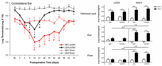 Infraorbital nerve injury in the rat induces hypersensitivity that spreads extraterritorially and is genetically dependent. In adult male WKY and LEW rats housed under similar environmental conditions, head withdrawal thresholds to mechanical stimulation of the facial vibrissal pads, ears and hindpaws were assessed bilaterally with von Frey monofilaments before (baseline [BL]) and after receiving unilateral transection (IONX) of the medial branch of the infraorbital nerve (that supplies medial aspect of upper lip, vibrissal pad and anterior teeth) or sham operation (n = 10/group). On the left is an example of the time course of the effect of the partial IONX (in comparison to sham) in inducing extraterritorial spread of sensitivity (ETSS) as reflected in a significant decrease in the withdrawal threshold to mechanical stimulation of the contralateral ear (2-way ANOVA, p < 0.05). This reflection of IONX-induced nociceptive behaviour occurred in both strains but was significantly greater and longer lasting in the WKY rats. Additional evidence of ETSS is illustrated on the right where WKY rats showed, at 3–5 weeks post-IONX, significantly (2-way ANOVA, p < 0.05) decreased mechanical withdrawal thresholds not only in the contralateral ear but also in in the lateral part of the partially denervated ipsilateral vibrissal pad, and ear and hindpaw. LEW rats also displayed significant ETSS but only for the vibrissal pad; their levels of mechanical hypersensitivity in the ear and hindpaw were significantly lower (t-test, p < 0.05) than those in WKY rats. They also showed significantly lower levels of heat hypersensitivity in these sites that were tested by applying noxious infrared laser heat stimuli (200 msec, 18–25 Amp, 2 mm in diameter diode) to these sites (not shown). * p < 0.05 comparison to baseline, ** p < 0.05 and # p < 0.05, ## p < 0.05 comparison between groups. Based on data from Wang et al. [120].