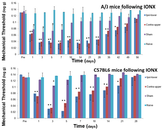 Infraorbital nerve injury in the mouse induces facial mechanical hypersensitivity that is genetically dependent. A/J and C57BL/6J male mice aged 8–12 weeks were maintained under similar environmental conditions, and were tested with von Frey monofilaments for facial mechanical sensitivity before and after unilateral transection (IONX) of the medial branch of the infraorbital nerve (that supplies medial aspect of upper lip, vibrissal pad and anterior teeth) or sham operation; naïve mice were also tested (n = 11/group). Baseline values of facial mechanical sensitivity as reflected in head withdrawal threshold were comparable in A/J and C57BL/6J mice, and following IONX both strains showed evidence of ETSS as reflected in hypersensitivity in the ipsilateral lower lip and contralateral upper lip when compared with the sensitivity in naïve and sham animals. However, the time course of the IONX-induced facial hypersensitivity was significantly different (2 way ANOVA, p < 0.05) between the two strains of mice: hypersensitivity in both A/J and C57BL/6J mice started around post-operative day 1, but in the A/J mice reached its peak throughout post-operative days 3–21 and lasted up to day 49, whereas in the C57BL/6J mice, hypersensitivity had a significantly shorter peak duration. Moreover, hypersensitivity lasted up to days 35 (contralateral upper lip) and 49 (ipsilateral lower lip) in A/J mice but only to days 14 and 21, respectively, in C57BL/6J mice. Sham animals (compared to naïve animals) showed a brief hypersensitivity that also was significantly longer in the A/J mice. * p < 0.05. Based on data from Varathan et al. [121] and Cherkas et al. [168].