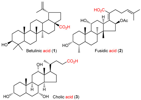 - Bednarczyk-Cwynar, B. An overwiew on the chemistry and biochemistry of triterpenoids. Mini-Rev. Org. Chem. 2014, 11, 251–252. [Google Scholar] [CrossRef]