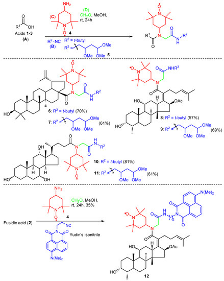 Sultani, H.N.; Morgan, I.; Hussain, H.; Roos, A.H.; Haeri, H.H.; Kaluđerović, G.N.; Hinderberger, D.; Westermann, B. Access to New Cytotoxic Triterpene and Steroidal Acid-TEMPO Conjugates by Ugi Multicomponent-Reactions. Int. J. Mol. Sci. 2021, 22, 7125. https://doi.org/10.3390/ijms22137125