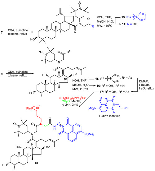 - Popov, S.A.; Shpatov, A.V.; Grigor’ev, I.A. Synthesis of substituted esters of ursolic, betulonic, and betulinic acids containing the nitroxyl radical 4-Amino-2,2,6,6-tetramethylpiperidine-1-oxyl. Chem. Nat. Compd. 2015, 51, 87–90. [Google Scholar] [CrossRef]
