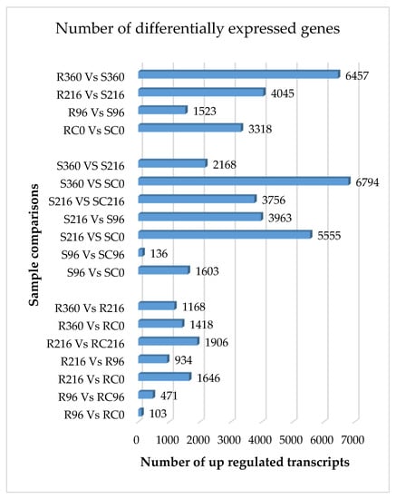 The time points R96 h, R216 h, and R360 h shared more upregulated genes than did their susceptible counterparts. In addition, the R360 h samples had more upregulated genes than did the S360 h samples (1338 vs. 781). At 0 h and 96 h, more genes were upregulated in the S genotype than in the R at the same time points. At 96 h post-infestation, a smaller overall number of transcripts were expressed (220 in the R and 1905 in the S, with 197 in common between the two genotypes). This stands in contrast to the 2179 and 3711 transcripts upregulated in the R216 h and S216 h samples, respectively, post-infestation, and the 1629 and 4353 transcripts upregulated in the R360 h and S360 h samples, respectively, post-infestation. There were also 796 transcripts upregulated in both genotypes at 360 h post infestation.
