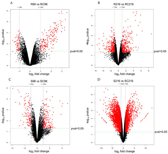 The statistical significance (p-value) and fold change of gene expression between treated and control plants at 96 h and 216 h post-infestation, for both R and S genotypes revealed significant differences in gene expression between control and infested samples in gene expression (Figure 2). A larger number of genes of the R genotype were significantly upregulated in treatment samples than in untreated controls at both 96 h and 216 h post-infestation (Figure 2A,B). On the other hand, similar numbers of genes were upregulated in treated and untreated plants of the S genotype (Figure 2C,D), although a larger number of genes were expressed at 216 h.