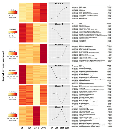 Cluster and gene ontogeny (GO) enrichment analyses revealed different gene response patterns at different times after SCA infestation (Figure 4). Six clusters of gene expressions were deduced by heat map and graphical representation. Expression of genes regulating protein and lipid binding, cellular catabolic processes, transcription initiation, and autophagic processes began at 96 h post-infestation and steadily increased from 216 h to 360 h (Cluster 1). Similarly, expression of genes underlying responses to external stimuli, starvation and stress, cellular communication, UDP glycosyltransferase activity, and proton transport began at 96 h, and showed sharp increases after 216 h (Cluster 3). In contrast, the expression of genes related to catalytic activity, oxidoreductases, acyl and glycosyl transferases, hydrolases, electron transport activities, phosphorylation, and protein folding, steadily decreased over time post-infestation (Cluster 2). Likewise, genes responsible for developmental processes such as DNA binding, regulation of cellular division and cell cycle, DNA metabolic processes, and membrane-bound organelles diminished with time post-infestation (Cluster 4). These genes were highly expressed at time of infestation (0 h) and their expression progressively diminished over time post-infestation.