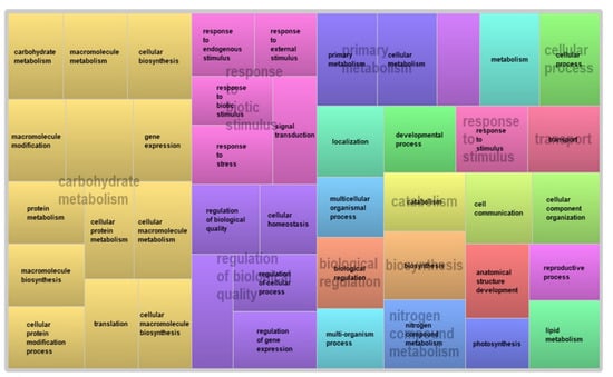 Annotation of DEGs in the R sorghum genotype at 360 h after sugarcane aphid infestation visualized with the reduced version of the plant gene ontology (REVIGO).