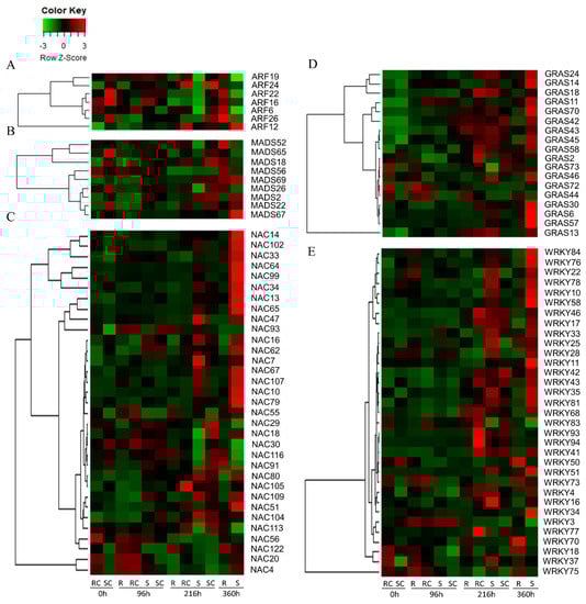 Nine MADS TFs were differentially expressed in the two genotypes at different time points post-infestation (Figure 6B). At 360 h post-infestation, MADS52, MADS18, MADS56, and MADS26 were upregulated more in the R than in the S genotype. On the other hand, the S genotype overexpressed MADS67, MADS22, and MADS2 at 360 h post-infestation when compared to the R genotype. Out of 33 NAC TFs differentially expressed, 18 were overexpressed in the S genotype (Figure 6C). In contrast, the R genotype consistently overexpressed NAC116 and NAC122 at 96 h post-infestation. Another NAC TF, NAC91 was overexpressed by the R genotype at 360 h, and by susceptible controls at 216 h and 96 h post-infestation. NAC4 and NAC20 were overexpressed in resistant controls at 0 h and 96 h post-infestation, and then remained mostly downregulated.