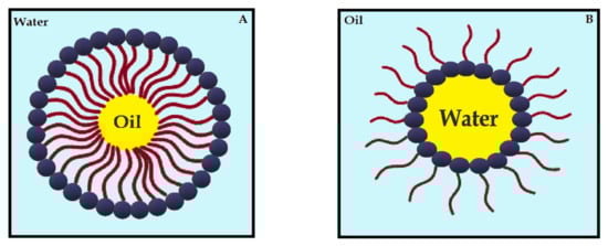 Schematic diagram of oil-in-water nanoemulsion (A) and water-in-oil nanoemulsion (B), stabilized by surfactants.