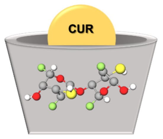 Cyclodextrins (CDs) have revolutionized the pharmaceutical industry in recent years [125]. CDs consist of three naturally occurring oligosaccharides in a cyclic structure produced from starch [126,127,128]. The natural CDs have their nomenclature system and their chemical structure based on the number of glucose residues in their structure: 6, 7, or 8 glucose units, which are denominated α-CD, β-CD, and γ-CD, respectively [129,130]. Although the entire CD molecule is soluble in water, the interior is relatively non-polar and creates a hydrophobic microenvironment. Therefore, CDs are cup-shaped, hollow structures with an outer hydrophilic layer and an internal hydrophobic cavity (Figure 5) [129]. They can sequester insoluble compounds within their hydrophobic cavity, resulting in better solubility and consequently better chemical and enzymatic stability [127]. Due to the cavity size, β-CD forms appropriate inclusion complexes with molecules with aromatic rings [131], such as CUR [132]. Antimicrobial studies with CUR in CDs are summarized in Table 5.