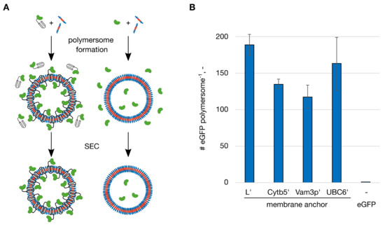 Functionalization of polymersomes with membrane-anchoring enhanced green fluorescent protein (eGFP). Polymersomes were functionalized with fusion proteins of eGFP and the membrane-anchoring peptides L’, Cytb5′, Vam3p’ and UBC6′ and without a membrane-anchoring peptide (eGFP). (A) The proteins with (left) or without (right) membrane anchor were mixed with the amphiphilic polymer (blue: hydrophilic blocks, red: hydrophobic block). The eGFP domains are shown in green, the membrane anchoring domains in grey. After polymersome formation, the dispersions were processed by size-exclusion chromatography (SEC) to separate the functionalized vesicles from unincorporated protein. (B) Number (#) of eGFP molecules per polymersome after the functionalization. The proteins were applied at a concentration of 0.50 g/L with the exception of eGFP-UBC6′ (0.40 g/L). Error bars represent the standard deviation in technical triplicates.