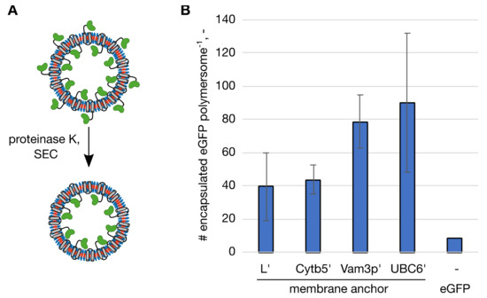 Maximal numbers of encapsulated enhanced green fluorescent protein (eGFP) molecules per polymersome with the respective membrane anchor and soluble eGFP without a membrane anchor as a control. (A) Polymersomes with membrane-anchoring eGFP were subjected to proteinase K digest and processed by size exclusion chromatography (SEC) to separate the polymersomes from the protein set free from the outer surface. The eGFP domains are shown in green, the membrane anchoring domains in grey. (B) Number (#) of encapsulated eGFP molecules per polymersome. Highest encapsulation was reached at different initial protein concentrations, L’: 0.75 g/L, Cytb5′: 0.78 g/L, Vam3p’: 0.30 g/L, UBC6′: 0.40 g/L and eGFP: 4.30 g/L. The standard deviation in technical triplicates is indicated by the error bars.