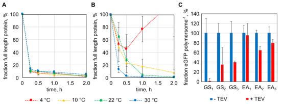 The TEV protease recognition sequence (ENLYFQS) was cloned into the gene of the eGFP fusion protein with the Cytb5′ membrane anchor, between the egfp gene and the sequence of the deca-alanine linker (pA) (egfp-pA-cytb5′). Flanking the TEV protease recognition sequence two repetitions of a flexible (GSSSS; GS2) or rigid (EAAAK; EA2) linker were included, resulting in the fusion proteins eGFP-GS2/TEV-Cytb5′ and eGFP-EA2/TEV-Cytb5′. Proteolysis of the two proteins by the TEV protease was tested at temperatures between 4 and 30 °C (Figure 3A,B). The eGFP-GS2/TEV-Cytb5′ construct was processed efficiently by the TEV protease, reducing the full-length protein to around 10% in 15 min (first probed time point) at all tested temperatures (Figure 3A). The fusion protein with the rigid linker eGFP-EA2/TEV-Cytb5′ was influenced to a greater extent by the present temperature (Figure 3B). At 30 °C, the amount of full-length protein was reduced to 10%, similar to eGFP-GS2/TEV-Cytb5′ but at 22 and 10 °C one and two hours, respectively, were necessary to digest more than 90% of the full-length protein. At 4 °C no coherent results were obtained (Figure 3B), indicating that proteolysis of eGFP-EA2/TEV-Cytb5′ should be done at temperatures between 10 and 30 °C. After showing proteolysis in solution, fusion proteins with linkers of different lengths, one to three repeats of the GS or EA sequences, were cloned and immobilized to the outer surface of polymersomes. Proteolysis with TEV protease was done overnight at 22 °C (room temperature) (Figure 3C). As seen in the previous experiments, constructs with the flexible linker were cut more efficient, removing between 59.6 and 98.9% of the immobilized protein from the polymersomes. When the rigid linker was part of the fusion protein only 4.2 to 35.0% of the proteins were removed (Figure 3C).