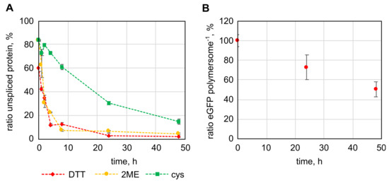 Intein-splicing mediated release of immobilized protein domains from the surface of polymersomes. (A): Splicing of the fusion protein of enhanced green fluorescent protein (eGFP), the Mycobacterium xenopi gyrase A intein and the Cytb5′ membrane anchor in solution by 50 mM dithiothreitol (DTT), 2-mercaptoethanol (2ME) and cysteine (cys). (B): Splicing of eGFP-Int(-1N)-Cytb5′ immobilized to the outer surface of polymersomes with 50 mM DTT. The error bars represent the deviation of three parallel experiments using samples originating from the same initial protein solution (A) or polymersome dispersion (B).