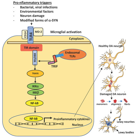 Schematical representation of TLR4 activation in microglia and consequent dopaminergic neuronal damage in the substantia nigra. A number of pro-inflammatory stimuli can promote the activation of the intracellular TLR4 signaling pathway in microglia. Upon infection or injury, DAMPs or PAMPs released in the extracellular milieu via exocytosis from neighboring neurons are sensed by microglial TLR4 for degradation and clearance. If compromised or if prolonged, this process can lead to further inflammatory signaling in which the engagement of myeloid differentiating primary response gene 88 (MyD88) or TIR-domain containing adapter inducing interferon β (TRIF) provokes the activation of downstream signaling cascades that lead to the proteasomal degradation of kB inhibitors (IkB), release, and nuclear translocation of the NF-kB (nuclear factor kappa-light-chain-enhancer of activated B cells) transcription factor. The transcriptional activation of specific genes induces the release of proinflammatory cytokines, that in turn can cause neuronal damage, pathological modification of α-SYN (monomers, oligomers, and fibrils, truncated and phosphorylated forms), and aggregation in Lewy and neurites bodies—the pathological hallmarks of degenerating neurons in Parkinson’s disease. Endosomal TLRs sense bacterial or viral nucleic acids.