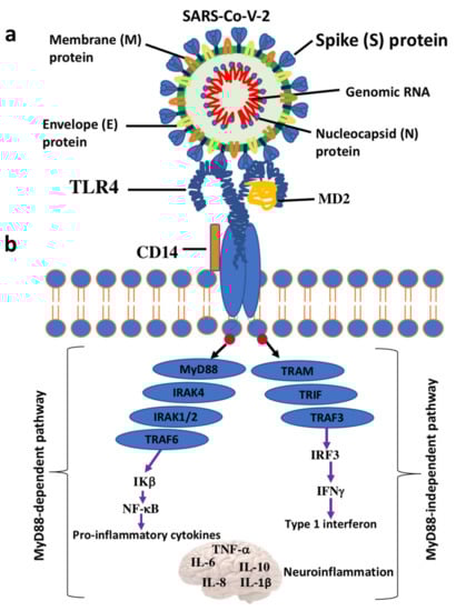 Toll-like receptor 4 (TLR4) signaling cascade resulting from the interaction between TLR4 and SARS-CoV-2 S protein. (a). Schematic diagram of the primary structural proteins of SARS-CoV-2.(b). The interaction between TLR4 and the SARS-CoV-2 S protein can trigger an intracellular TLR4 signaling cascade that can be one of the factors leading to the cytokine storm and neuroinflammation in severe COVID-19 patients. SARS-CoV-2: Severe Acute Respiratory Syndrome Coronavirus 2; Coronavirus disease. CD14: cluster of differentiation 14; MD2: myeloid differential protein-2; MyD88: myeloid differentiating primary response gene 88; NF-kB: nuclear factor kappa-light-chain-enhancer of activated B cells; IRAK: interleukin-1 receptor-associated kinases; TRIF: TIR-domain containing adapter inducing interferon β; TRAM: TRIF-related adaptor molecule; TRAF: tumor necrosis factor receptor-associated factor; IFN: interferon.