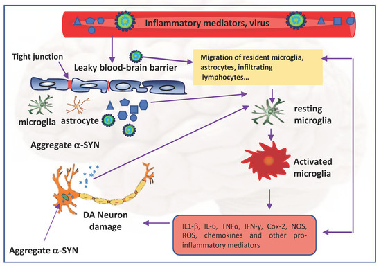 A growing body of evidence indicates that neuroinflammation is involved in the pathogenesis of several neurodegenerative diseases including PD [54,55,56,57], Alzheimer’s disease (AD) [58], amyotrophic lateral sclerosis [59], Huntington’s disease, and virus-associated dementia [60,61]. Neuroinflammation implicates the recruitment of immune and non-immune cells at the site of injury or infection, such as resident macrophages, i.e., microglia, aside from astrocytes, endothelial cells, infiltrating T-lymphocytes, α-SYN reactive T-lymphocytes, and major histocompatibility complex (MHC) class II-positive microglia [62,63,64,65]. Microglia are the most abundant populations in the brain parenchyma and represent the major cell type involved in neuroinflammation However, sophisticated neuron–microglia–astrocyte crosstalk also plays a critical role in the immune response [66,67,68].