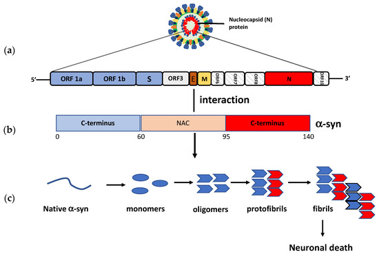 Possible direct interaction between the spike protein and α-sinuclein. (a) SARS-CoV-2 genome organization. Open Reading Frames (ORFs); Envelope (E); Nucleocapside (N); Membrane protein (M). (b) Schematic depiction of α-synuclein structure. N-terminus, NAC (non-amyloid-β component) region, and C-terminus are coloured blue, pink and red, respectively. (NAC). (c) The possible direct interaction between SARS-CoV-2 and α-SYN could start a conformational shift of the monomeric protein and accelerate the formation of toxic multimeric protein species, such as oligomers/protofibrils and fibril aggregates, resulting in neuronal death.
