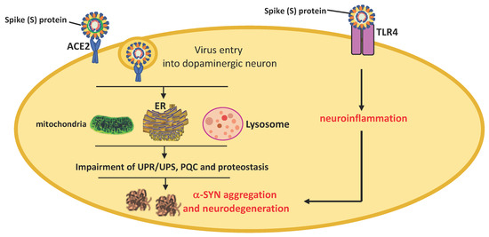 Possible mechanism proposed for α-synuclein aggregation in dopaminergic neurons. The binding of the S protein to the ACE2 receptor mediates the virus entry into dopaminergic cells. In the host cells, the virus can induce endoplasmic reticulum (ER) stress and adaptive unfolded protein response (UPR) and ubiquitin proteasome system (UPS) activation, leading to impairment of proteostasis, α-SYN aggregation, and neurodegeneration. A similar mechanism can be triggered by SARS-CoV-2-induced TLR4 activation.