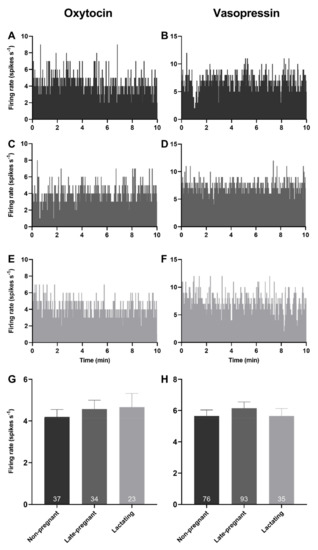 2.1. Basal Firing Rate of Oxytocin and Vasopressin Neurons in Non-Pregnant, Late-Pregnant, and Lactating Rats