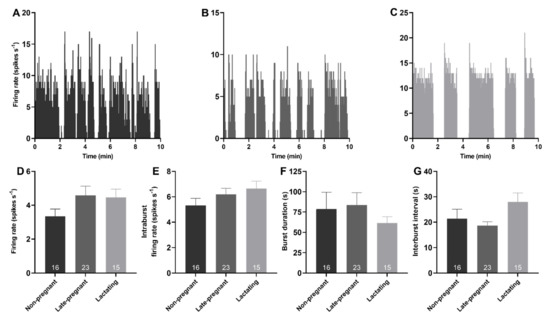 Here, we found that basal firing rate was not different between oxytocin neurons in non-pregnant, late-pregnant, and lactating rats or between vasopressin neurons in non-pregnant, late-pregnant, and lactating rats, consistent with our previous observations [21,22]. Nevertheless, hazard analyses revealed a reorganisation of activity in oxytocin neurons, but not vasopressin neurons, in late-pregnant and lactating rats that favoured the occurrence of short intervals between successive spikes that are necessary to achieve the high firing rates evident during burst firing in birth and lactation. In contrast to oxytocin neurons, the activity of vasopressin neurons in late-pregnant and lactating rats was indistinguishable from that in non-pregnant rats. The maintenance of vasopressin neuron activity in the face of lower plasma osmolality in late pregnancy and lactation appears to involve increased osmosensitivity.