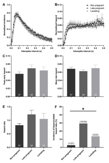 There was no effect of reproductive status on the peak early hazard (H = 0.82, p = 0.66), mean late hazard (H = 1.81, p = 0.40), or hazard ratio (H = 4.72, p = 0.09) of all (non-phasic and phasic) vasopressin neurons (Figure 4). Similarly, there was no effect of reproductive status on the peak early hazard (H = 0.17, p = 0.92), mean late hazard (H = 4.27, p = 0.12), or hazard ratio (H = 0.41, p = 0.82) of phasic vasopressin neurons (Figure S2). There was no difference in the incidence of hazard ratios that reached the threshold to be classified as elevated post-spike hyperexcitability in vasopressin neurons in non-pregnant, late-pregnant, and lactating rats (χ2 = 2.38, p = 0.30; Figure 4F).