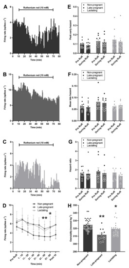 Ruthenium red inhibited vasopressin neuron activity in non-pregnant, late-pregnant, and lactating rats. (A–C) Ratemeter recordings (in 30 s bins) of the firing rates of vasopressin neurons in non-pregnant (A), late-pregnant (B), and lactating (C) rats before and during microdialysis administration of ruthenium red (RuR; 10 mM). (D) Mean firing rate (in 10 min bins ± SEM) of vasopressin neurons in non-pregnant, late-pregnant, and lactating rats before and during microdialysis administration of ruthenium red (10 mM). Ruthenium red induced a similar reduction in the firing rate of vasopressin neurons in non-pregnant, late-pregnant, and lactating rats (REPRODUCTIVE STATUS: F2,28 = 0.69, p = 0.51; TIME: F6,28 = 5.94, p < 0.001; interaction between REPRODUCTIVE STATUS and TIME: F12,32 = 0.29, p = 0.99, two-way repeated measures ANOVA). * p < 0.05 and ** p < 0.01 compared to pre-RuR within TIME, Holm–Sidak post hoc tests. (E–G) Mean (±SEM) peak early hazard (E), late hazard (F), and peak early/mean late hazard ratio (G) in vasopressin neurons from non-pregnant, late-pregnant, and lactating rats. There was no effect of REPRODUCTUVE STATUS or TIME on the peak early hazard (F1,28 = 1.70, p = 0.20), mean late hazard (F1,26 = 0.37, p = 0.85), or hazard ratio (F1,26 = 0.21, p = 0.81) of vasopressin neurons during ruthenium red administration, and no interaction between REPRODUCTUVE STATUS and TIME. (H). Mean (±SEM) plasma osmolality in non-pregnant, late-pregnant, and lactating rats. Plasma osmolality was affected by reproductive status (H = 20.0, p < 0.001). * p < 0.05 and ** p < 0.01. Dunn’s post hoc tests compared to non-pregnant rats.