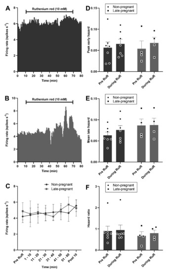 Ruthenium red did not affect oxytocin neuron activity in non-pregnant and late-pregnant rats. (A,B) Ratemeter recordings (in 30 s bins) of the firing rates of oxytocin neurons in non-pregnant (A) and late-pregnant (B) rats before and during microdialysis administration of ruthenium red (RuR; 10 mM). (C) Mean firing rate (in 10 min bins ± SEM) of oxytocin neurons in non-pregnant and late-pregnant rats before and during microdialysis administration of ruthenium red (10 mM). Oxytocin neuron activity was not affected by ruthenium red in non-pregnant or late-pregnant rats (REPRODUCTIVE STATUS: F1,9 = 0.03, p = 0.87; TIME: F6,9 = 1.10, p = 0.37; interaction between REPRODUCTIVE STATUS and TIME: F6,9 = 1.00, p = 0.41, two-way repeated measures ANOVA). (D–F) Mean (±SEM) peak early hazard (D), late hazard (E), and peak early/mean late hazard ratio (F) in oxytocin neurons from non-pregnant, late-pregnant, and lactating rats. There was no effect of REPRODUCTIVE STATUS or TIME on the peak early hazard (F1,9 = 0.58, p = 0.46), mean late hazard (F1,9 = 1.97, p = 0.19), or hazard ratio (F1,9 = 0.09, p = 0.77) of oxytocin neurons during ruthenium red administration, and no interaction between REPRODUCTUVE STATUS and TIME.