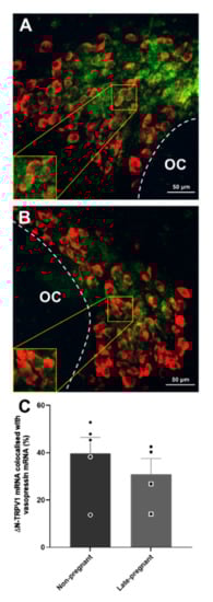 Vasopressin mRNA and ΔN-TRPV1 mRNA expression in the supraoptic nucleus of non-pregnant and late-pregnant rats. (A,B) Example compressed Z-stacks of vasopressin mRNA (red) and ΔN-TRPV1 mRNA (green) labelling in the supraoptic nucleus of non-pregnant (A) and late-pregnant (B) rats. OC: optic chiasm. (C) Mean levels of ΔN-TRPV1 mRNA and vasopressin mRNA co-labelling in the supraoptic nucleus of non-pregnant and late-pregnant rats. There was no difference in ΔN-TRPV1mRNA expression (p = 0.66, unpaired t-test), vasopressin mRNA expression (p = 0.71), or co-expression of ΔN-TRPV1 mRNA and vasopressin mRNA between non-pregnant and late-pregnant rats (p = 0.41).