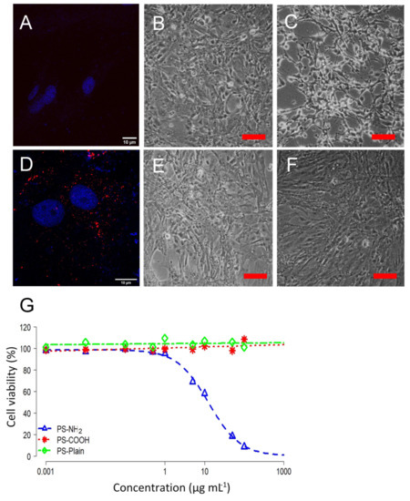 Cytotoxicity of SaB-1 cells exposed to functionalized polystyrene nanoplastics (PS-NH2, PS-COOH and PS-Plain) for 24 h. Representative confocal fluorescence microscopy images of unexposed SaB-1 cells (A) or exposed to 12 μg mL−1 of red PS-COOH for 24 h (D). Blue and red fluorescence indicate cellular DNA (DAPI) and PS-COOH (Micromer®-redF), respectively. Scale bar is fixed at 10 µm. Representative phase contrast microscope images of SaB-1 cell cultures unexposed (B; Control) or exposed for 24 h to 12 µg mL−1 of PS-NH2 (C), PS-COOH (E) or PS-Plain (F). Scale bar represents 100 μm. (G). Cytotoxicity curves of SaB-1 cells exposed to functionalized polystyrene nanoplastics. Percent cell viability is calculated as percentage of the control or unexposed cells (n = 3) and lines represent the fitted curves.