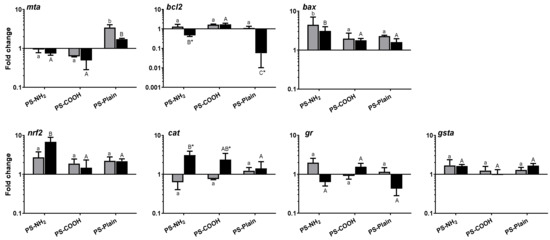 Transcriptional profile of SaB-1 cells exposed to 1 (grey bars) or 12 (black bars) µg mL−1 of functionalized polystyrene nanoplastics (PS-NH2, PS-COOH and PS-Plain) for 24 h. Data are presented as mean fold change of the relative gene expression in NP-exposed cells compared to unexposed cells ± SEM (n = 3). Different lowercase and uppercase letters denote significant differences between functionalized NPs at 1 µg mL−1 or 12 µg mL−1, respectively whilst significant differences between the two concentrations are noted by asterisks, according to ANOVA and Tukey’s post-hoc tests (p < 0.05). PS, polystyrene; NP, polystyrene nanoplastics; mta, Metallothionein A; bcl2, Bcl-2-associated X protein; bax, B-cell lymphoma 2; nrf2, Nuclear factor (erythroid-derived 2)-like 2; cat, Catalase; gr, Glutathione reductase; gsta, Glutathione S-transferase A.