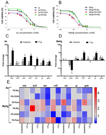 The potential impact of NPs on the toxicity and transcriptomics of SaB-1 cells exposed to metals was evaluated as above. For this, two salts were tested: methylmercury (II) chloride [CH3HgCl] (MeHg); and arsenic trioxide (As2O3) (As) (Sigma–Aldrich, St. Louis, MO, USA). For the cytotoxicity evaluation, cells were exposed to metal concentrations ranging from 0.001 to 0.1 mM alone or in combination with a fixed concentration of 1 μg mL−1 NPs, which could be close to the worst environmental scenarios [47,69], and the viability assayed by the MTT as above. Controls lacked metals and NPs. For the transcriptomic study, SaB-1 cells were exposed to a sublethal (0.005 mM) and the LC50 dosage of the respective metal, alone or in combination with 1 µg mL−1 NPs, and the gene expression evaluated as above.