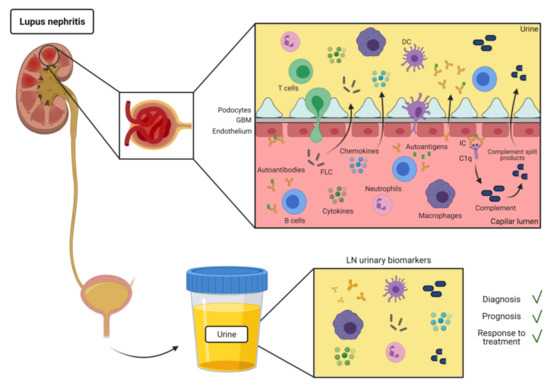 Finally, it is worth mentioning other immune-related enzymes or molecules present in urine from SLE patients that could be used as biomarkers. One example is the NGAL, expressed in neutrophils. This molecule is involved in the iron trafficking in the kidney and in the inflammatory responses by sequestering neutrophil chemoattractants [120]. NGAL expression is induced in the nephron in response to epithelial injury [121] and its level appeared increased in urine after renal injury [122,123]. In a study including a total of 70 SLE patients and 20 controls, the levels of urinary NGAL in LN patients were significantly higher than in non-LN patients [61].
