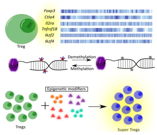 In the case of regulatory T cells, DNA methylation is particularly important. Several studies revealed more than 100 differentially methylated regions (DMRs) in Tregs compared to Teffs. CpG hypomethylation in Tregs-related genes, such as Ctla4 exon 2, Foxp3 intron 1, Tnfrsf18 exon 5, Ikzf4 intron 1b, and Il2ra intron 1a, is limited to Tregs and persists after cell stimulation [,]. It is worth emphasizing that Tregs-specific hypomethylation of critical genes is a dynamic process during Tregs development. It begins at the precursor stage and continues until full cellular maturity [].