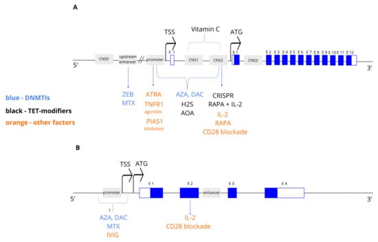 Overview of the structure of the Foxp3 (A) and Ctla4 (B) genes and the location of the epigenetic modifiers’ action. CNS0-1—conserved-non-coding elements; E—exon; TSS—transcription start site; ATG—translation initiation codon; ZEB—zebularine; AZA—azacytidine; DAC—decitabine; MTX—methotrexate; ATRA—all-trans retinoic acid; H2S—hydrogen sulfide; AOA—aminooxyacetic acid; RAPA—rapamycin; IVIG—intravenous immune globulin.