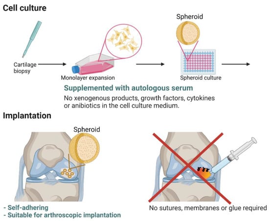 For the manufacturing of ACI with spheroids, autologous chondrocytes are culture expanded and subsequently cultured as spheroids using culture medium supplemented with only autologous serum and without other supplements such as growth factors, cytokines, and or antibiotics. The spheroids are self-adhering to subchondral bone, allowing for arthroscopic implantation and omitting the need for sutures, membranes, and glue. This figure was created with BioRender.com.