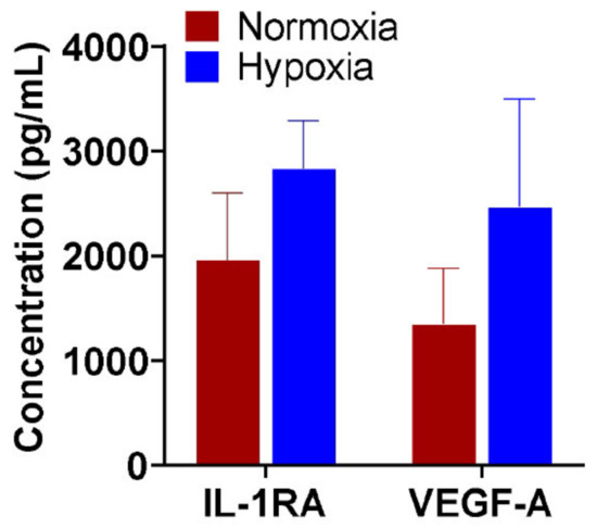 Placental membrane (AM and CM) and UC priming, and growth factor analysis were completed as follows: AM, CM, and UC from three donors were cut into 3 × 4 cm dimension pieces using a scalpel and template. One 3 × 4 cm piece of each tissue was placed in a 10 cm cell culture dish and resuspended in 12 mL of DMEM + 2.5% FBS. Two sets were prepared, where one dish from each representative tissue was placed in a 37 °C incubator with 20% O2 (normoxia) and another dish was placed in a 37 °C incubator with 2% O2 (hypoxia). After 48 h, the dishes were removed from the incubator, and the tissue pieces were collected. Each 3 × 4 cm tissue piece was placed into a 2 mL Eppendorf tube and chopped finely using fine scissors. To the tube, 1 mL of T-PER (Thermo Fisher, Waltham, MA, USA) + protease inhibitor (Roche, St. Louis, MO, USA) was added to aid in tissue and cell lysis. To the tube, one 5 mm steel bead (Qiagen, Germantown, MD, USA) was added, and then the tube was placed in a TissueLyser LT (Qiagen, Germantown, MD, USA) and disrupted at maximum speed for 2 min, in three total cycles. The tube was then centrifuged at 14,000 rpm, and the supernatant was collected into another tube and frozen at −80 °C until assayed. The collected placental membrane lysates and supernatants were assayed using Multiplex (R&D Systems, Minneapolis, MN, USA) assay kit containing VEGF-A and IL-1RA. The assay was processed as per standard kit protocol and read using Luminex Magpix multiplex reader (Luminex, Austin, TX, USA).