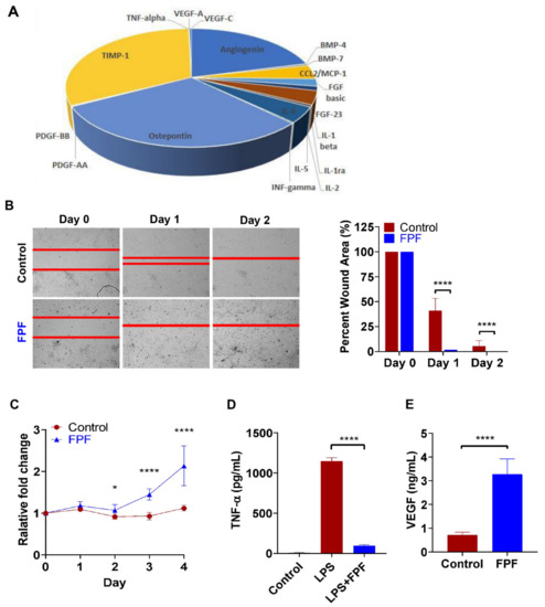 Tissue injury associated beneficial factors and their regenerative effects. (A) Representative presence of growth factors in FPF as determined by Luminex. N = 3 donors. (B) Representative photograph of HDF wound closure after incubation with FPF conditioned media. Graph shows significant reduction in wound area upon treatment with FPF conditioned media. Red line shows scratch gap closure (C) The viability of HDF cells was measured using MTT assay, and data are expressed as relative fold change compared to day 0. (D) Anti-inflammatory activity of FPF was evaluated by inhibition of TNFα release from stimulated human PBMCs. Unstimulated and stimulated PBMCs alone served as positive and negative controls, respectively. (E) Angiogenic activity of FPF was determined by a cell-based reporter assay that measured VEGF stimulation and inhibition of KDR (VEGFR-2) using luciferase as a readout. Results are shown as mean ± SD (N = 3). * p < 0.05, **** p < 0.0001.