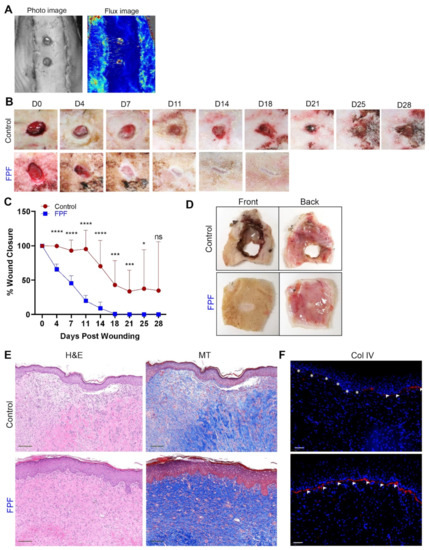 FPF accelerates wound closure in a rat ischemia wound model. (A) Representative photo image (left panel) and Doppler flux image (right panel), 10 min after completion of surgery, to confirm presence of ischemia in the bipedicle flap region. (B) Representative photographs of wounds taken over a 28-day period after wounding in control and FPF-treated groups. (C) Wound areas were measured and expressed as a percent of the wound area at day 0. Mean-SD for 5 rats per treatment group are shown for each time point on the graphs. N = 10, ns: not significant, * p < 0.05, *** p < 0.005, **** p < 0.001 FPF versus control. (D) Representative front and back photographs of necropsied tissue at day 28 after wounding for control and FPF-treated animals. (E) The structural integrity of healed tissue after wound closure in control and FPF-treated animals was assessed histologically by staining tissue sections with H&E (left panel) or MT (right panel). Scale bar = 5×, 192 μm (F) Basement membrane in the tissue samples collected after wound closure was visualized by collagen IV (Col IV) staining (red). Nuclei were counterstained with DAPI (blue). White asterisks highlight the absence of the basement membrane; white arrowheads highlight the basement membrane. Scale bar = 50 μm. N = 6/group.