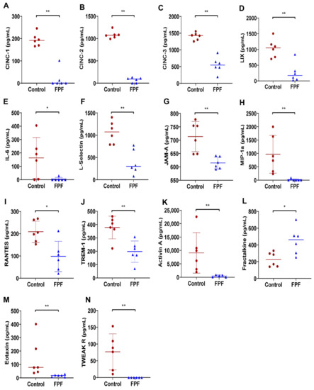 Anti-inflammatory effect of FPF on wound healing-associated cytokines. Levels of cytokines and chemokines in the wound tissue collected after wound closure for (A) CINC-1, (B) CINC-2, (C) CINC-3, (D) LIX, (E) IL-6, (F) L-selectin, (G) JAMA-A, (H) MIP-1α, (I) RANTES, (J) TREM-1, (K) activin A, (L) fractalkine, (M) eotaxin, and (N) TWEAK R. N = 6 rats/group. * p < 0.05, ** p < 0.01.