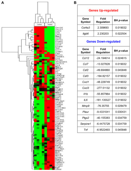 The complexity of nonhealing chronic wounds, largely in part due to the mixture of altered cytokine and growth factors in the wound bed, is orchestrated by misaligned transcription factors and dysregulated gene expression signatures. Gene array analysis of the collected healed tissue from both control and FPF-treated animals was performed to elucidate the wound healing gene signatures (Figure 7). The gene array included 84 rat wound healing-associated genes. The nonsupervised hierarchical clustering of genes with a heat map illustrates the fold change in genes expressed in control vs. FPF-treated wounds (Figure 7A). The criterion used to screen down- or upregulated genes was fold change of ≥2 and a Benjamini–Hochberg adjusted p-value ≤0.05 to increase strictness during panel profiling. Individual genes most significantly over- or under-expressed after FPF treatment are listed in the table (Figure 7B).
